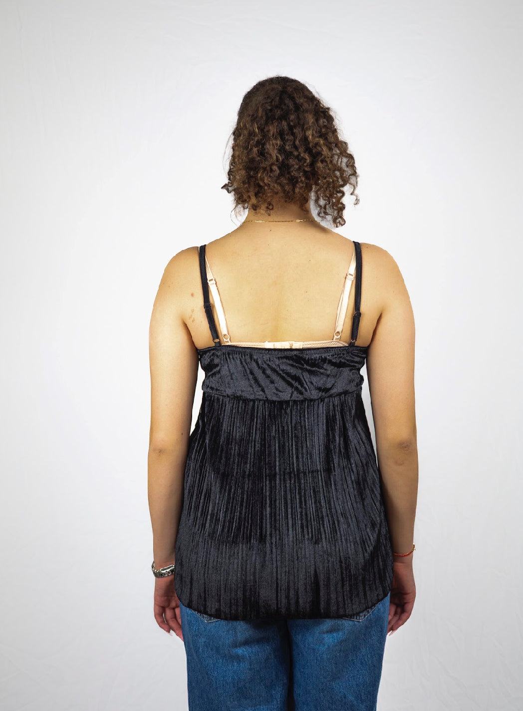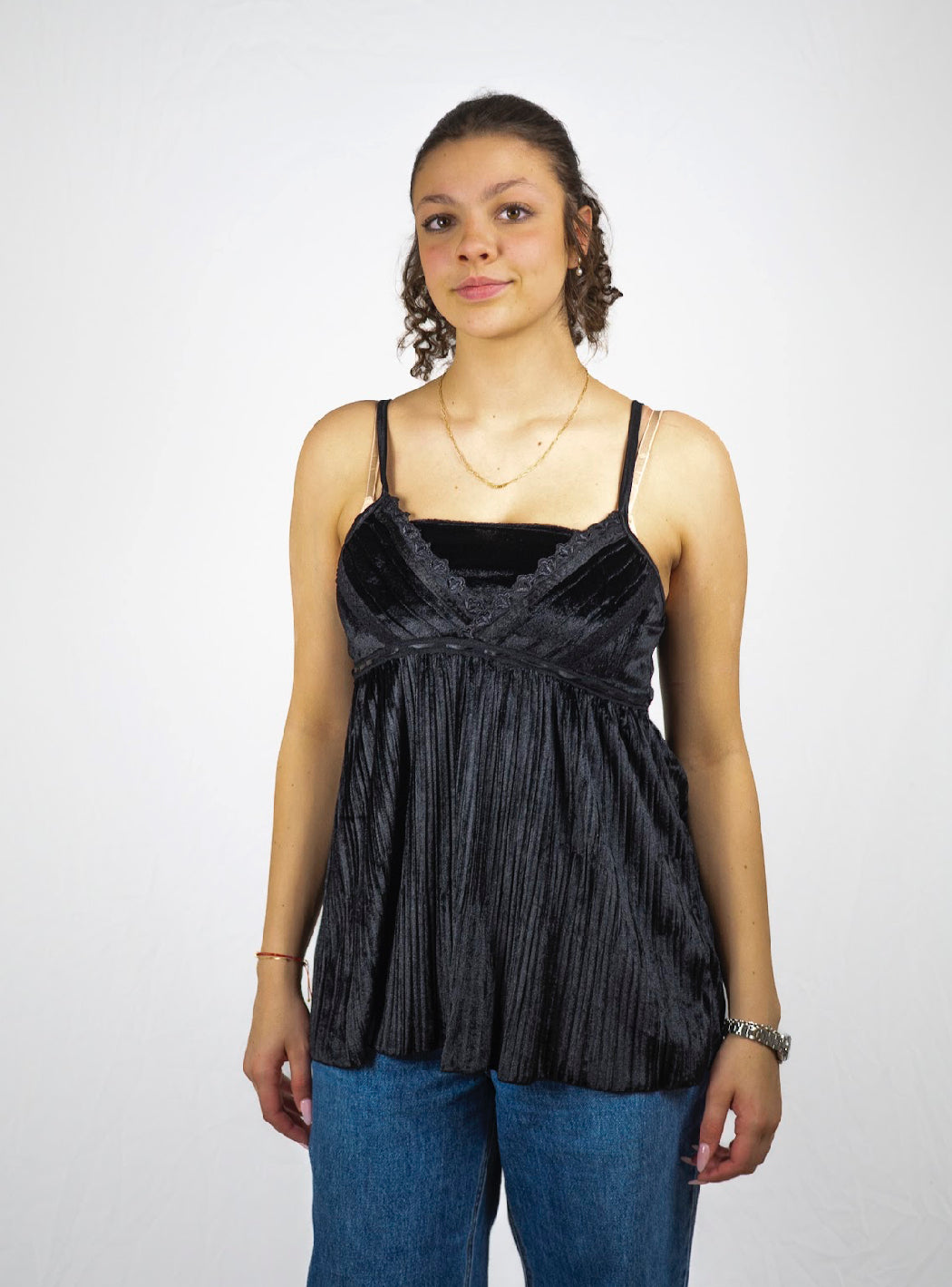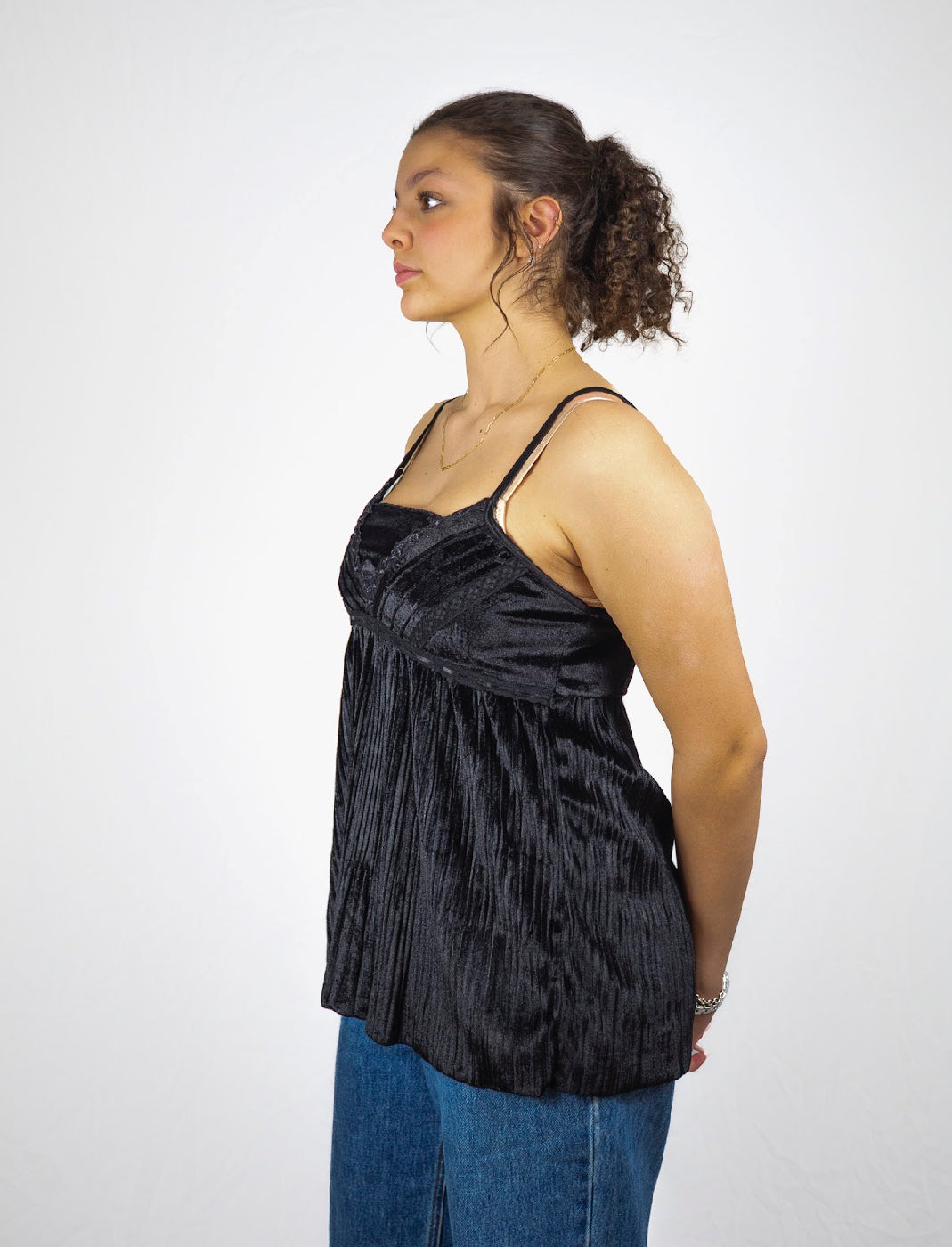 Flowy velour detail black lace camisole