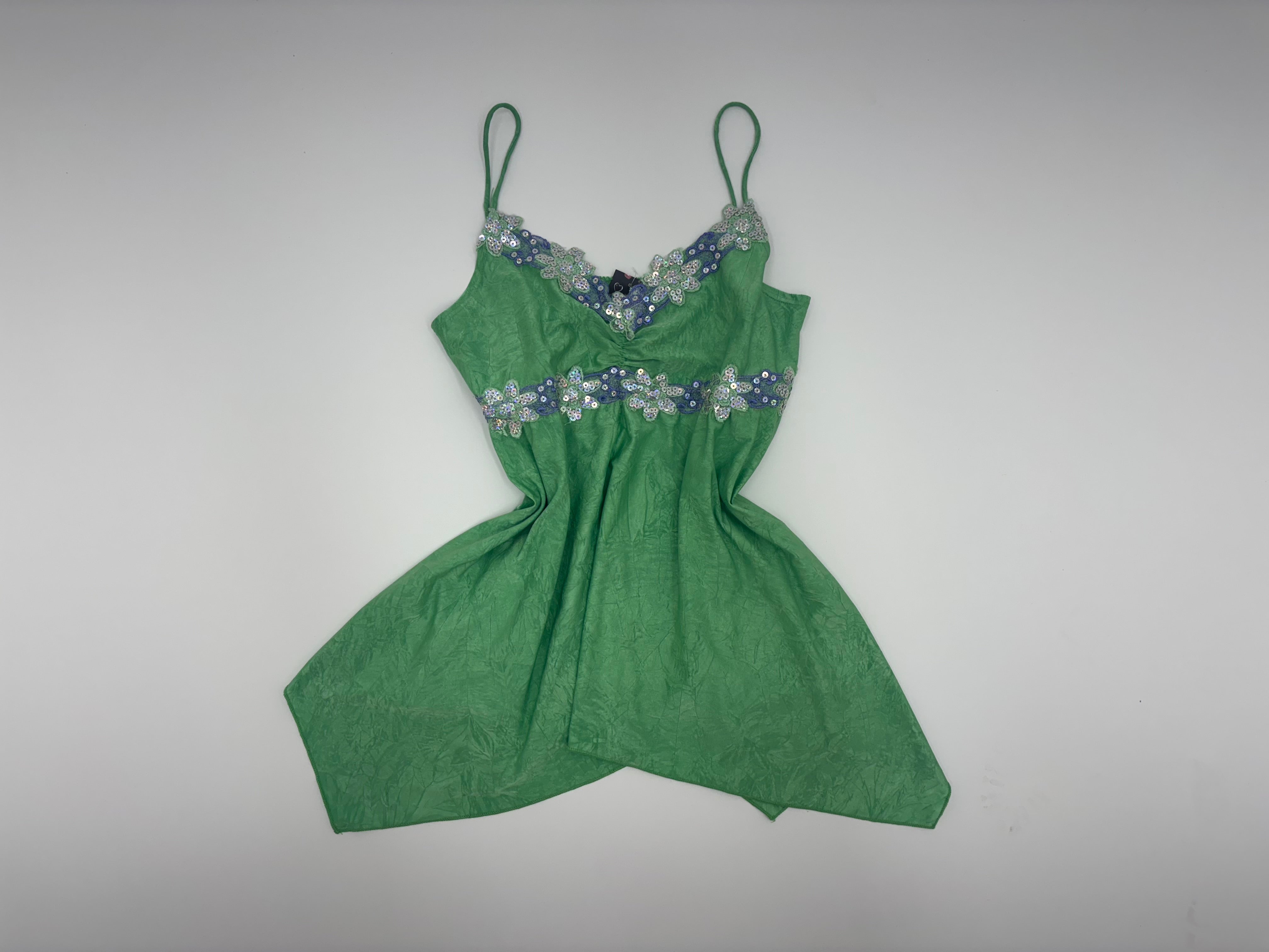 This iconic green cami is decked out in sparkling bedazzled details that give it a true Y2K, statement-making vibe. The soft, stretchy fabric offers a comfy fit while still serving maximum shine. Perfect for nights out, layering, or adding a pop of fun to any everyday outfit.