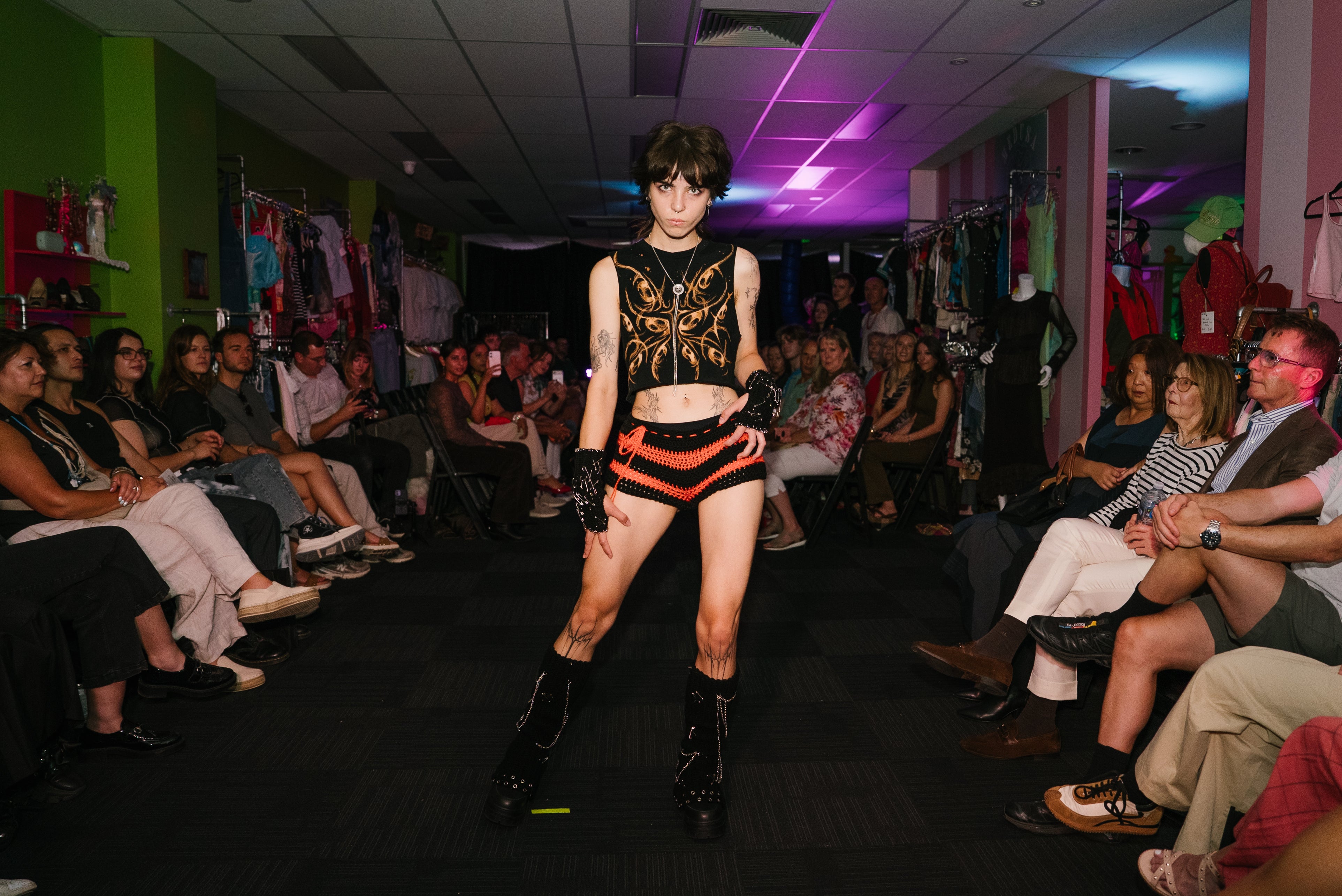 Ataraxia original custom punked legwarmers, matching gloves & black x orange striped shorts